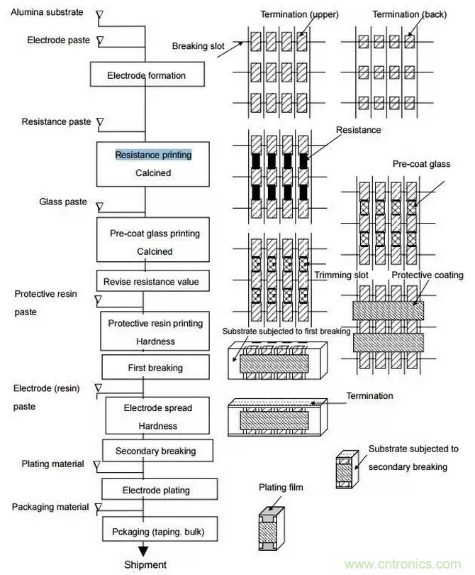 厚(hou)膜(mo)電(dian)阻(zu)采(cai)用(yong)的(de)絲(si)網(wang)印(yin)刷(shua)法(fa),就(jiu)是(shi)再(zai)陶(tao)瓷(ci)基(ji)底(di)上(shang)貼(tie)一(yi)層(ceng)鈀(ba)化(hua)銀(yin)電(dian)極(ji),然(ran)後(hou)在(zai)電(dian)極(ji)之(zhi)間(jian)印(yin)刷(shua)一(yi)層(ceng)二(er)氧(yang)化(hua)釕(liao)作(zuo)為(wei)電(dian)阻(zu)體(ti)。厚(hou)膜(mo)電(dian)阻(zu)的(de)電(dian)阻(zu)膜(mo)通(tong)常(chang)比(bi)較(jiao)厚(hou),大(da)約(yue)100微米。具體工藝流程如下圖所示。