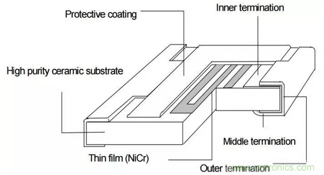 薄膜電阻就是氧化鋁陶瓷基底上通過真空沉積形成鎳化鉻薄膜,通常隻有0.1um厚,隻有厚膜電阻的千分之一,然後通過光刻工藝將薄膜蝕刻成一定的形狀。Thin Film工(gong)藝(yi)在(zai)此(ci)前(qian)電(dian)容(rong)和(he)電(dian)感(gan)的(de)文(wen)章(zhang)中(zhong)已(yi)經(jing)提(ti)到(dao)過(guo)多(duo)次(ci)了(le),光(guang)刻(ke)工(gong)藝(yi)十(shi)分(fen)精(jing)確(que),可(ke)以(yi)形(xing)成(cheng)複(fu)雜(za)的(de)形(xing)狀(zhuang),因(yin)此(ci),薄(bo)膜(mo)電(dian)容(rong)的(de)性(xing)能(neng)可(ke)以(yi)控(kong)製(zhi)的(de)很(hen)好(hao)。