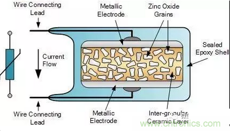 壓敏電阻通常都是金屬氧化物可變電阻,即Metal Oxide Varistor(MOV),其電阻材料是氧化鋅顆粒和陶瓷顆粒混合後一起燒結成型。MOV的特性就是當電壓超過一定閾值的時候,電阻迅速下降,可以通過大電流,因此可以用於浪湧防護和過壓保護。