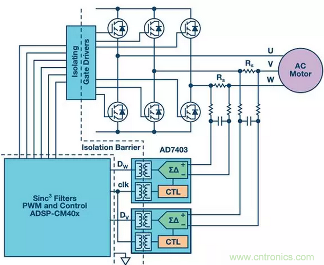 圖1所示為一個典型三相永磁電機驅動係統,其利用檢測電阻測量繞組電流,並通過ADI公司的AD7403隔離式Σ-Δ調製器和sinc3濾波器提供反饋。AD7403使用單個二階調製器數字化電路來將檢測電阻的模擬信號轉換為隔離的一位數字脈衝流,其大小取決於滿量程輸入電壓範圍。然後,sinc3濾波器提取電流平均值,同時消除逆變器開關產生的噪聲。其存儲器可以存儲一個代表電流的16位(wei)整(zheng)數(shu),與(yu)此(ci)同(tong)時(shi),它(ta)可(ke)以(yi)將(jiang)該(gai)數(shu)值(zhi)與(yu)一(yi)個(ge)代(dai)表(biao)電(dian)流(liu)限(xian)值(zhi)的(de)基(ji)準(zhun)值(zhi)相(xiang)比(bi)較(jiao),如(ru)果(guo)發(fa)生(sheng)過(guo)載(zai),它(ta)就(jiu)會(hui)通(tong)過(guo)單(dan)獨(du)的(de)引(yin)腳(jiao)發(fa)送(song)警(jing)報(bao)。利(li)用(yong)更(geng)短(duan)的(de)濾(lv)波(bo)器(qi)監(jian)控(kong)過(guo)載(zai),並(bing)將(jiang)其(qi)與(yu)測(ce)量(liang)濾(lv)波(bo)器(qi)並(bing)聯(lian),可(ke)以(yi)縮(suo)短(duan)警(jing)報(bao)延(yan)遲(chi)時(shi)間(jian)。