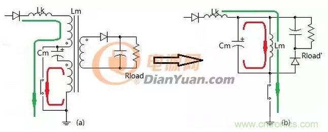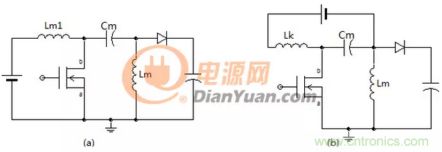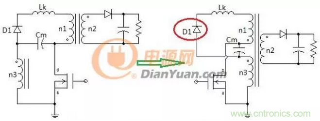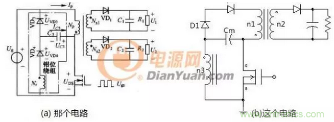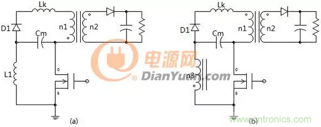 圖2中的兩個電路是一樣的隻是形式不同,如果去掉電容Cm電路的左側就如同一個帶去磁繞組的正激變壓器初級側,同樣這裏的線圈n1、n3也要采用雙線並繞,如果兩線圈耦合的好二極管D1是可以省掉的,如果耦合的不好就會產生圖1中(a)的效果會有一部分無功損耗。