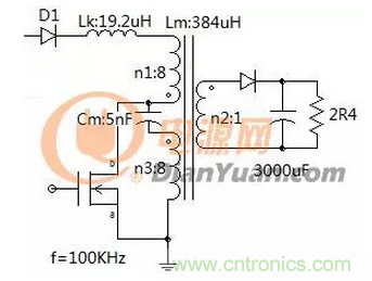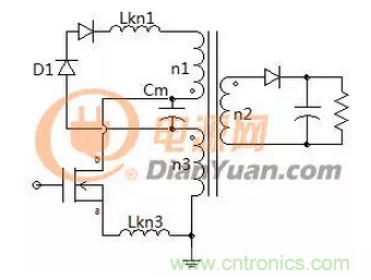 在前麵圖2中初級線圈n1、n3是采用雙線並繞,在這個應用中不采用並繞的方式或者是額外引入漏感使n1、n3線圈都寄生有漏感,電路如下:
