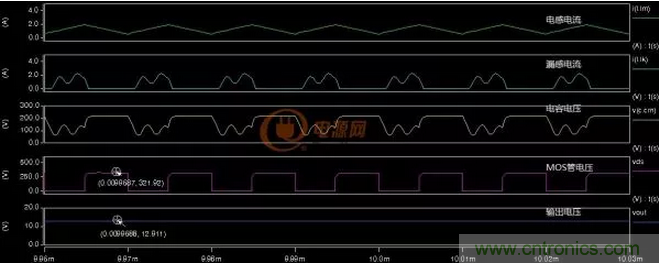 在上圖中漏感電流是斷續的,電容Cm的最大電壓200V左右,MOS管的Vds電壓321V左右。