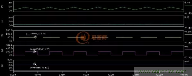 當電容Cm增大後對漏感的吸收也變強了,此時漏感可以設計的大一些,上圖3-2中可以看到漏感的電流已經為連續模式了(可去掉二極管D1),漏感電流亦既輸入電流,輸入電流連續可以提升電源的性能如果用於功率因數校正可以實現連續模式的反激PFC功能。圖中電容Cm的電壓鉗位在輸入電壓(113V)左右,MOS管的Vds電壓215V左右為輸入電壓+反射電壓(100V左右)之和,由此可推斷在高壓輸入300V時MOS管的Vds電壓為300+100=400V左右,MOS管可以選用低電壓型號的,電容Cm容量大了成本也會高這個可能需要權衡一下。