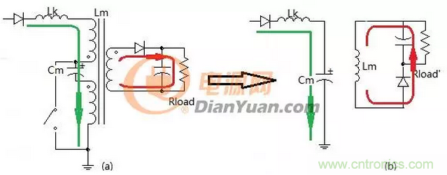 見圖4-1-2中的(b)等效電路,在開關關斷期間輸入和輸出可視為兩個獨立的電路,輸入側漏感Lk的能量被電容Cm吸收,輸出側電感Lm對負載釋放能量。