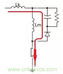 假設初級兩線圈耦合的好,當開關關閉時上圖中的(a)就等效於圖(b)其結果為主電感被免疫掉了,換言之電容Cm隻吸收漏感能量不吸收主電感能量。