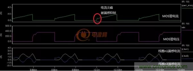 從圖4-2-4中可以看出增加的漏感Lkn3很好的抑製了電流尖峰,不過漏感Lkn3上的能量隻能傳遞回電源形成無功功率,好在這部分能量不大無功損耗也就更小了。