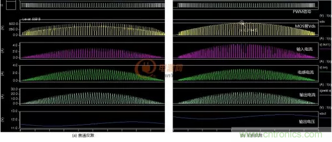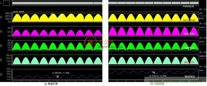 上圖中(a)普通反激電路Vds有尖峰電壓這是漏感造成的,圖(b)無損吸收則沒有這個電壓尖峰,而且隻用了18nF的電容。兩種電路都采用的是臨界模式控製,輸入電流、輸出電流都是斷續的,輸出電壓上疊加有工頻紋波。
