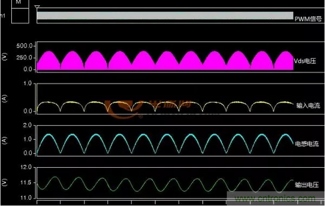 假設初級線圈耦合的比較好可以去掉原D1二極管,因漏感和電容會發生震蕩所以把D1串入到輸入端隻為方便觀察波形。在有的應用中反而要加大這個LC震蕩,比如QR模式的軟開關。