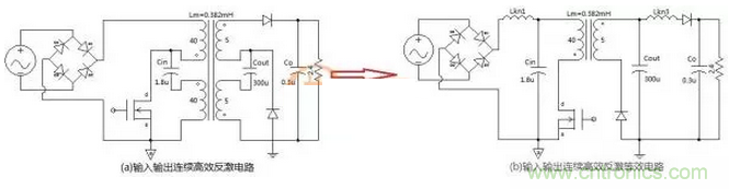 兩個電路的區別就在於二極管的接法略有不同,圖(b)這個電路能達到更高的效率而且可以實現軟開關。