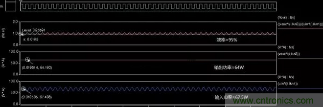 仿真的電路中二極管管壓降為0.3V元器件直流阻抗1m歐,忽略開關損耗及磁芯損耗,從仿真結果看效率可以達到95%左右。