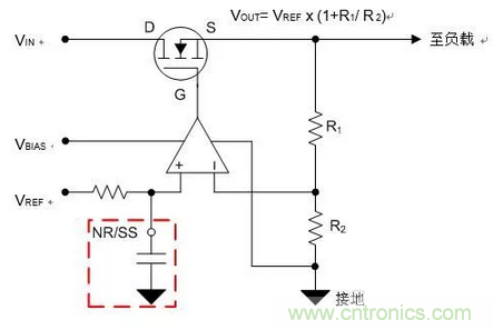 TI的許多低噪聲LDO係列都具有專門用作“NR/SS”的專用引腳,如圖 3 所示。