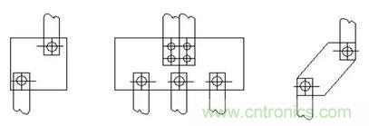 (8)母mu線xian寬kuan度du大da和he長chang度du短duan都dou不bu能neng曲qu立li彎wan,進jin出chu線xian母mu排pai寬kuan度du差cha比bi較jiao大da時shi,可ke在zai不bu影ying響xiang搭da接jie麵mian積ji的de前qian提ti下xia,允yun許xu有you過guo度du母mu排pai,偏pian向xiang母mu線xian的de一yi側ce或huo改gai變bian母mu線xian的de連lian接jie。見jian下xia圖tu