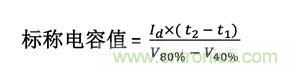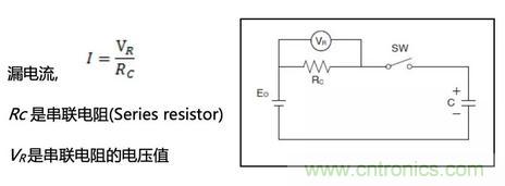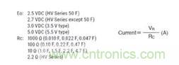 除了部份生產商直接提供參數值外,“漏電流值”可通過向超級電容器施加電壓直至特定時間後測量電阻器兩端的電壓,再根據以下簡單方程計算便能得出。