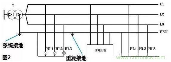 在這樣的供電係統中地線和零線合二為一稱之為PEN線,值得注意的是這種係統中的PEN線需要在配電網中重複接地形成一個接地網,以保證PEN線的零電位。