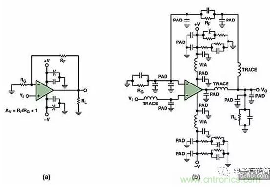 所謂寄生效應,按照字麵意思就是那些出現在PCB板中並在電路中大施破壞、lingrentoutongqieyuanyinbumingdexiaoguzhang。tamenjiushishenrugaosudianluzhongyinzangdejishengdianronghejishengdiangan。qizhongbaokuoyoufengzhuangyinjiaoheyinzhixianguochangsuoxingchengdejishengdiangan;焊盤(pad)到地、焊盤到電源平麵和焊盤到印製線之間形成的寄生電容;通孔之間的相互影響,以及許多其他可能的寄生效應。(圖三)(a)顯示一個典型的同相運算放大器原理圖。但是,如果考慮寄生效應的話,同樣的電路可能會變成圖三(b)那樣。