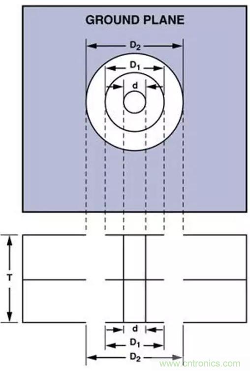 εr表示PCB材料的相對磁導率。T表示PCB的厚度。D1表示環繞通孔的焊盤直徑。D2表示接地平麵中隔離孔的直徑。所有尺寸均以cm為單位。在一塊0.157 cm厚的PCB上一個通孔就可以增加1.2nH的寄生電感和0.5pF的寄生電容;這就是為什麼在給PCB佈線時一定要時刻保持警覺的原因,要將寄生效應的影響降至最小。
