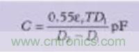 當尋找有問題的寄生源時,可能用得著幾個計算上述那些寄生電容尺寸的基本公式。(公式一)是計算平行極板電容器的公式,如(圖五)。