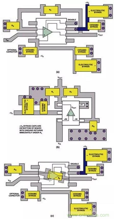 (圖九) 同一運算放大器電路的佈線區別:(a)SOIC封裝;(b)SOT-23封裝;(c)在PCB下麵採用RF的SOIC封裝
