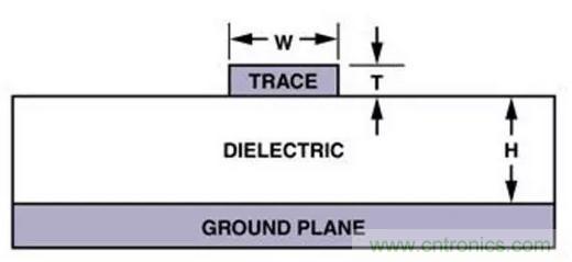 微帶控製阻抗印製線,如(圖十三)所示,可以用在PCB的任意一麵;它直接採用其下麵的接地平麵作為其參考平麵。