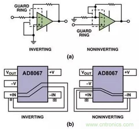 (公式七)baohuhuan,huozhechenggelihuan,shiyunsuanfangdaqichangyongdelingyizhongzhezhaofangfa,tayongyufangzhijishengdianliujinruminganjiedian。qijibenyuanlihenjiandan,yongyitiaobaohudaoxianjiangminganjiedianwanquanbaoweiqilai,daoxianbaochihuozheposhitabaochi(低阻抗)與敏感結點相同的電勢,因此使吸收的寄生電流遠離了敏感結點。(圖十五)(a)顯示了用於運算放大器反相配置和同相配置中保護環的原理圖。圖十五(b)則顯示用於SOT-23-5封裝中兩種保護環的典型佈線方法。