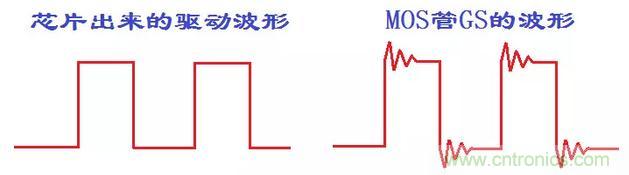 我們測試MOS管GS波形時,有時會看到下圖中的這種波形,在芯片輸出端是非常好的方波輸出,但一旦到了MOS管的G極就出問題了,有振蕩,這個振蕩小的時候還能勉強過關,但是有時候振蕩特別大,看著都教人擔心會不會重啟。