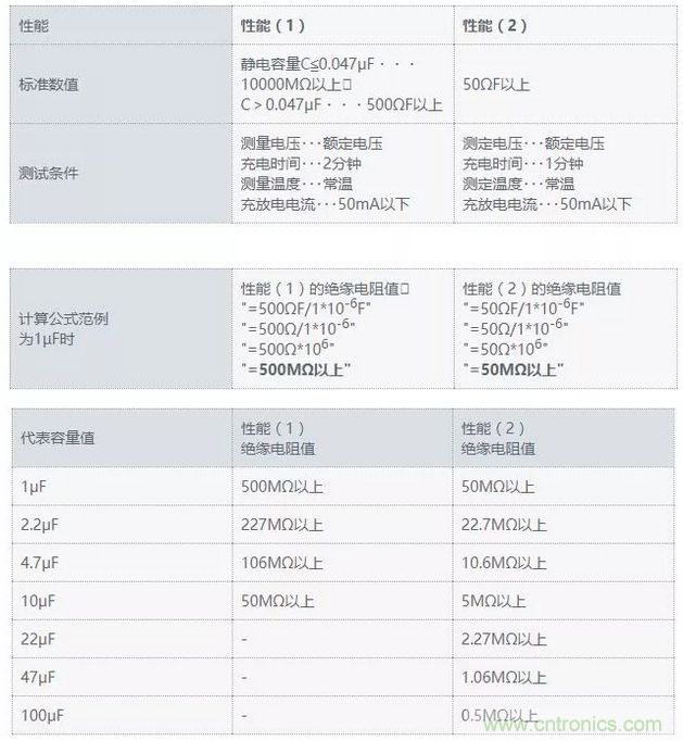 如上表所示,電容值越高,其絕緣電阻值越低。