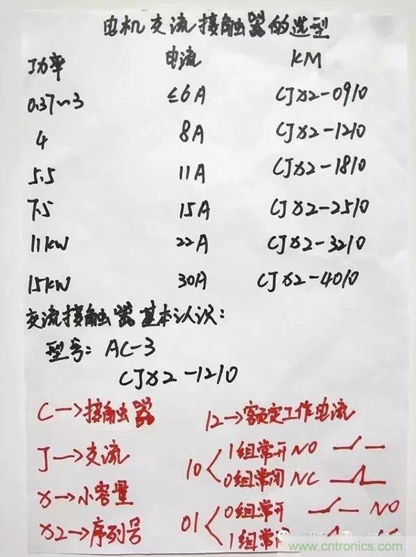 解釋:圖片上方為電動機的額定功率~工作電流~交流接觸器的型號規格,三者是一一對應的!例如:15kw的電機,工作電流大概為30a,我們可以選用cjx2–4010的交流接觸器。
