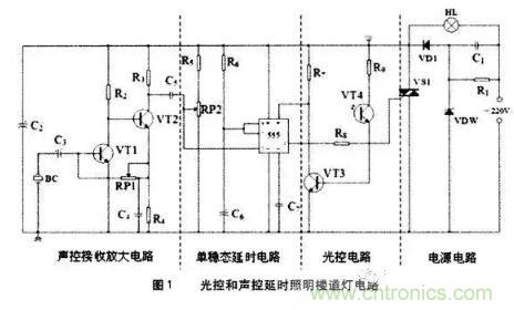 但dan從cong多duo年nian從cong事shi電dian子zi技ji術shu教jiao學xue的de經jing驗yan中zhong,我wo覺jiao得de識shi讀du電dian子zi電dian路lu原yuan理li圖tu還hai是shi有you一yi定ding方fang法fa可ke以yi遵zun循xun的de,下xia麵mian分fen享xiang一yi些xie結jie合he光guang控kong和he聲sheng控kong延yan時shi照zhao明ming樓lou道dao燈deng電dian路lu(圖1)做的總結。
