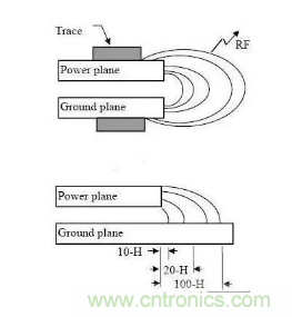 “20H規則”的采用是指要確保電源平麵的邊緣要比0V平麵邊緣至少縮入相當於兩個平麵間層距的20倍。