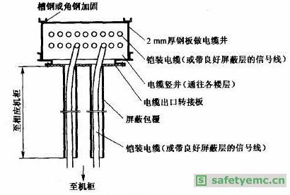 (3)電纜豎井處的電纜進出由於電纜豎井是作為同一個屏蔽區域,從電纜豎井至各層機房(非屏蔽區)的管線處理也非常重要。做法如圖2所示