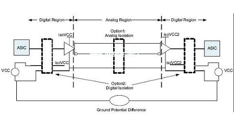 如圖4所(suo)示(shi),通(tong)過(guo)相(xiang)對(dui)於(yu)其(qi)他(ta)電(dian)路(lu)組(zu)件(jian)而(er)言(yan)的(de)高(gao)阻(zu)抗(kang),隔(ge)離(li)中(zhong)斷(duan)了(le)由(you)電(dian)路(lu)通(tong)路(lu)形(xing)成(cheng)的(de)環(huan)路(lu)。通(tong)過(guo)中(zhong)斷(duan)該(gai)環(huan)路(lu),噪(zao)聲(sheng)電(dian)壓(ya)出(chu)現(xian)在(zai)隔(ge)離(li)層(ceng)上(shang),而(er)非(fei)出(chu)現(xian)在(zai)接(jie)收(shou)機(ji)或(huo)更(geng)為(wei)敏(min)感(gan)的(de)組(zu)件(jian)上(shang)。噪(zao)聲(sheng)電(dian)壓(ya)的(de)高(gao)電(dian)平(ping)可(ke)以(yi)由(you)外(wai)部(bu)電(dian)流(liu)或(huo)電(dian)壓(ya)源(yuan)(例如:電感馬達和閃電(lightning))耦合。[page]