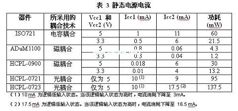 除了隔離層上信號傳輸的效率之外,輸入和輸出調節電路的設計同功耗的相關性最大。如表3所示,與電感或電容實例相比,光耦合器的功耗會更高。