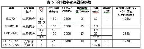 zaoshengjiangdihezaoshengbaohushidegeliqizainaxiegeliqizhongduanjiedihuanlubingjiangjiedidianyachagelidedianzidianluzhongdedaoguangfanshiyong。shejirenyuanxianzaiyongyouxuduoyonglaijinxingshuzixinhaogelidexuanze,baokuoTI推出的ISO72x係列,其在信號速率、電介質擊穿電壓、瞬態抗擾度、功耗、磁場抗擾度以及可靠性等重要特性方麵均表現不俗。表6對本報告中所討論實例的這些特性進行了總結。