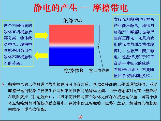 舉ju一yi個ge具ju體ti的de例li子zi,比bi如ru說shuo我wo現xian在zai這zhe個ge人ren站zhan在zai地di上shang,我wo是shi光guang著zhe腳jiao,地di板ban是shi導dao電dian的de,這zhe個ge椅yi子zi是shi絕jue緣yuan的de,我wo從cong地di麵mian一yi站zhan到dao椅yi子zi上shang就jiu相xiang當dang於yu我wo帶dai電dian了le。為wei什shen麼me?因yin為wei我wo原yuan來lai是shi極ji化hua帶dai電dian,上shang麵mian帶dai負fu電dian,下xia麵mian帶dai正zheng電dian,我wo站zhan在zai地di上shang下xia麵mian就jiu變bian成cheng零ling,上shang麵mian變bian成cheng了le-100v,站上去的時候相對來說我就變成帶電的人。所以,很多在半導體車間或者和集成電路接觸、打(da)交(jiao)道(dao)的(de)人(ren),不(bu)要(yao)隨(sui)隨(sui)便(bian)便(bian)用(yong)人(ren)摸(mo)集(ji)成(cheng)電(dian)路(lu),因(yin)為(wei)你(ni)這(zhe)個(ge)人(ren)不(bu)知(zhi)不(bu)覺(jiao)就(jiu)帶(dai)電(dian)了(le),你(ni)從(cong)門(men)外(wai)麵(mian)走(zou)進(jin)房(fang)子(zi)裏(li)很(hen)可(ke)能(neng)就(jiu)帶(dai)電(dian)了(le),在(zai)上(shang)樓(lou)梯(ti)或(huo)者(zhe)地(di)板(ban)鋪(pu)有(you)一(yi)層(ceng)絕(jue)緣(yuan)的(de)東(dong)西(xi),在(zai)絕(jue)緣(yuan)以(yi)外(wai)的(de)時(shi)候(hou)你(ni)不(bu)帶(dai)電(dian),站(zhan)上(shang)去(qu)就(jiu)帶(dai)電(dian)了(le),因(yin)為(wei)上(shang)麵(mian)有(you)電(dian)層(ceng)。還(hai)有(you)空(kong)調(tiao)的(de)風(feng)吹(chui)出(chu)來(lai)的(de)空(kong)氣(qi)會(hui)和(he)你(ni)身(shen)體(ti)上(shang)麵(mian)的(de)衣(yi)服(fu)進(jin)行(xing)摩(mo)擦(ca)、感應,它容易帶電,用靜電筆來測,隨便碰衣服或頭發,上麵帶的電基本上都有300v左右,如果摩擦幾下大概就有4000-5000v,所以靜電感應是相當厲害的,很多模型電路在送到工廠的時候就是用盒子包bao裝zhuang,因yin為wei盒he子zi是shi導dao電dian的de,如ru果guo用yong電dian表biao去qu量liang它ta好hao像xiang沒mei有you電dian阻zu,電dian阻zu是shi無wu窮qiong大da,其qi實shi它ta是shi導dao電dian的de,相xiang對dui來lai說shuo電dian導dao率lv很hen低di,也ye就jiu是shi電dian阻zu很hen大da。