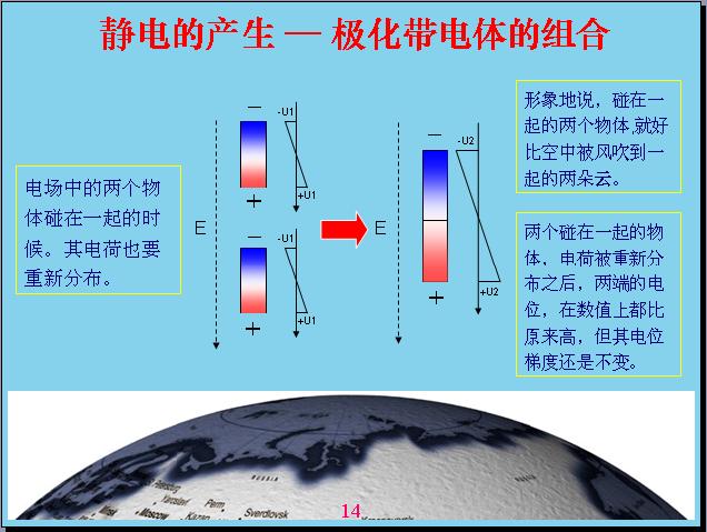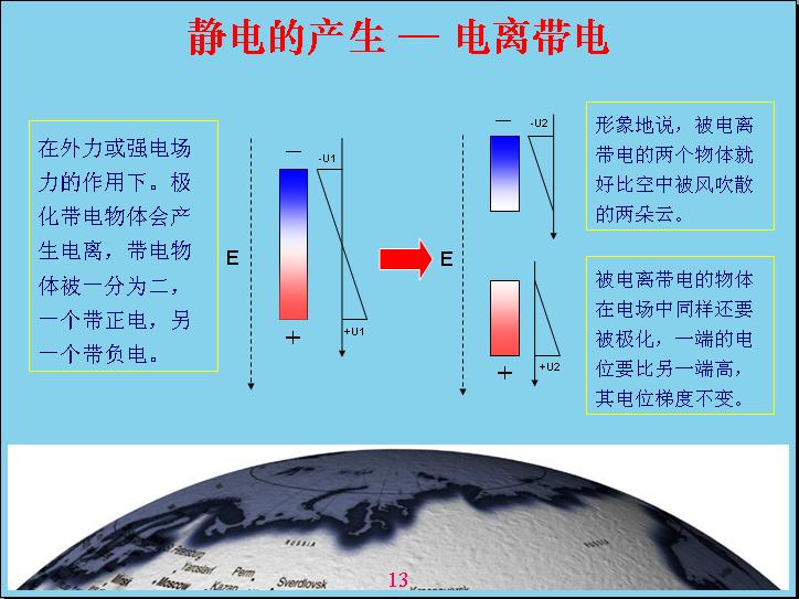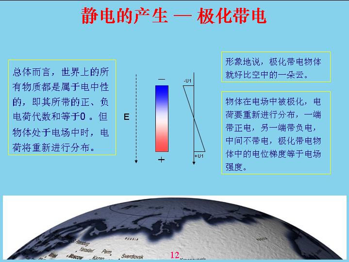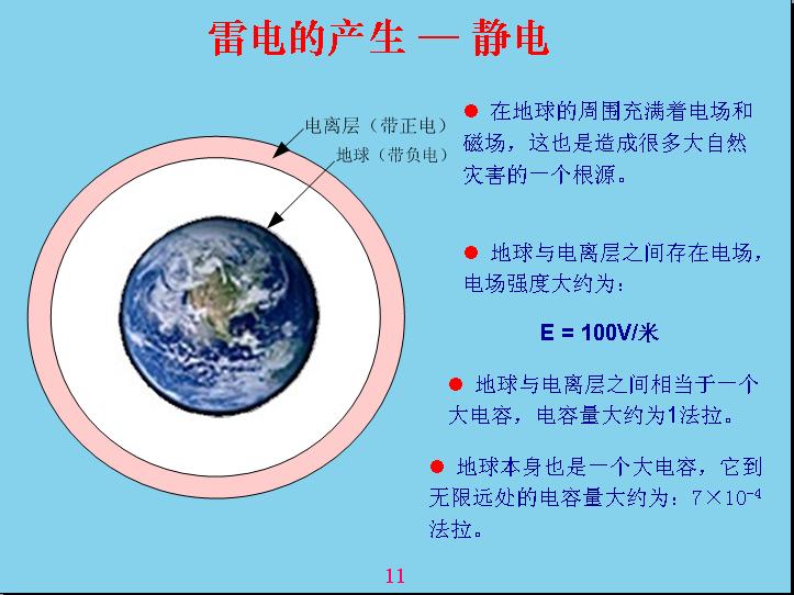 為wei什shen麼me會hui產chan生sheng雷lei電dian?可ke能neng大da部bu分fen人ren都dou不bu知zhi道dao,我wo在zai這zhe裏li就jiu給gei大da家jia講jiang解jie一yi下xia雷lei電dian是shi怎zen麼me產chan生sheng的de。雷lei電dian是shi由you於yu電dian磁ci場chang產chan生sheng的de,世shi界jie上shang什shen麼me電dian都dou是shi通tong過guo電dian磁ci場chang反fan應ying產chan生sheng的de。為wei什shen麼me會hui產chan生sheng雷lei電dian呢ne?因yin為wei在zai離li地di球qiu30公裏外有一個電離層,電離層實際上就是最外的空氣受到太陽光、ziwaixianzhaosheerchanshengdianli,taiyangguangshijishangyeshiyizhongdiancibo,diancibodezuoyongxiangdangyuwomenbayigeshiwufangzaiweibolulimianjiare,yuanlishichabuduode,danshiweibodebochangxianhenchang,ziwaixianxiangdangduan,suoyizuoyongbuyiyang,yongweibolubunengbakongqijinxingdianli,zhiyouziwaixiannenggoudianli。beidianliyihouhuifenchengliangceng,yicengdaizhengdian,yicengdaifudian,yudiqiuxiangduideyicengdaizhengdian,diqiujiushidaifudian。diqiushiyigeyuande,daidiandehuaxiangdangyudiancengqiangdushisanfaxingde,yuekaojindiqiudianrongqiangduyuegao,kaojindiqiubiaomianshi100v,也就是說一米高的位置電容強度是100v電(dian)容(rong)強(qiang)度(du)就(jiu)是(shi)用(yong)這(zhe)個(ge)來(lai)表(biao)示(shi),大(da)家(jia)在(zai)中(zhong)學(xue)裏(li)麵(mian)很(hen)少(shao)用(yong)電(dian)位(wei)梯(ti)度(du)的(de)概(gai)念(nian)表(biao)達(da)電(dian)容(rong)強(qiang)度(du),後(hou)麵(mian)我(wo)們(men)在(zai)工(gong)作(zuo)中(zhong)還(hai)是(shi)用(yong)電(dian)位(wei)梯(ti)度(du)來(lai)表(biao)示(shi)電(dian)容(rong)強(qiang)度(du)是(shi)最(zui)合(he)適(shi)的(de),比(bi)如(ru)靈(ling)敏(min)度(du)、多duo少shao毫hao伏fu米mi都dou是shi屬shu於yu電dian感gan強qiang度du。以yi前qian是shi用yong牛niu頓dun的de力li學xue來lai表biao達da,那na個ge概gai念nian相xiang對dui來lai說shuo比bi較jiao難nan理li解jie,兩liang個ge帶dai電dian物wu體ti之zhi間jian產chan生sheng多duo少shao牛niu頓dun力li的de時shi候hou,換huan算suan成cheng單dan位wei來lai表biao示shi電dian容rong強qiang度du,這zhe個ge強qiang度du不bu太tai好hao理li解jie,如ru果guo用yong電dian位wei梯ti度du表biao示shi就jiu很hen方fang便bian了le。