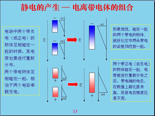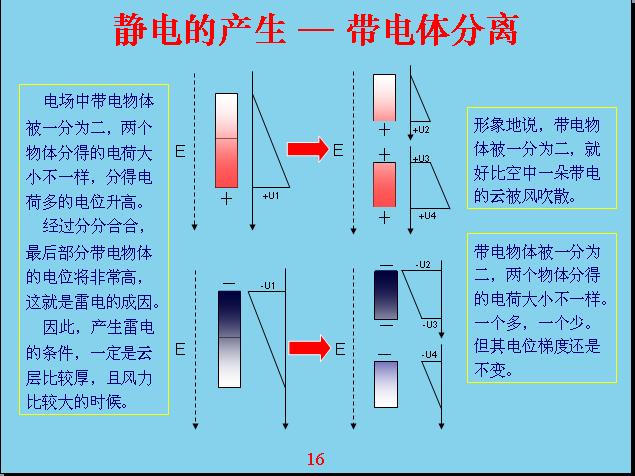 如(ru)果(guo)一(yi)個(ge)帶(dai)電(dian)體(ti)之(zhi)間(jian)分(fen)開(kai)的(de)話(hua),就(jiu)有(you)一(yi)個(ge)大(da)的(de)電(dian)位(wei),絕(jue)對(dui)值(zhi)相(xiang)對(dui)來(lai)說(shuo)也(ye)會(hui)偏(pian)高(gao),這(zhe)就(jiu)是(shi)因(yin)為(wei)雲(yun)受(shou)到(dao)極(ji)化(hua)帶(dai)電(dian)以(yi)後(hou),分(fen)分(fen)離(li)離(li)又(you)合(he)合(he),使(shi)得(de)雲(yun)帶(dai)的(de)電(dian)越(yue)來(lai)越(yue)高(gao)。帶(dai)電(dian)越(yue)來(lai)越(yue)高(gao)以(yi)後(hou)能(neng)量(liang)也(ye)越(yue)來(lai)越(yue)高(gao),兩(liang)個(ge)碰(peng)在(zai)一(yi)起(qi)就(jiu)會(hui)放(fang)電(dian),就(jiu)會(hui)產(chan)生(sheng)雷(lei)電(dian),雷(lei)電(dian)就(jiu)是(shi)這(zhe)樣(yang)產(chan)生(sheng)的(de)。雷(lei)電(dian)就(jiu)是(shi)因(yin)為(wei)在(zai)地(di)球(qiu)的(de)外(wai)圍(wei)空(kong)間(jian)裏(li)麵(mian)存(cun)在(zai)電(dian)場(chang),雲(yun)又(you)受(shou)到(dao)風(feng)的(de)作(zuo)用(yong),才(cai)會(hui)互(hu)相(xiang)分(fen)離(li)又(you)互(hu)相(xiang)組(zu)合(he),使(shi)帶(dai)電(dian)物(wu)體(ti)的(de)電(dian)位(wei)越(yue)來(lai)越(yue)高(gao),最(zui)後(hou)形(xing)成(cheng)放(fang)電(dian)。 還hai有you摩mo擦ca帶dai電dian也ye是shi由you於yu電dian場chang產chan生sheng的de,因yin為wei兩liang種zhong不bu同tong的de物wu體ti有you接jie點dian電dian位wei差cha,電dian磁ci也ye是shi靠kao兩liang種zhong不bu同tong物wu體ti產chan生sheng的de電dian位wei差cha,最zui後hou產chan生sheng化hua學xue作zuo用yong,之zhi前qian電dian場chang沒mei有you發fa生sheng化hua學xue作zuo用yong的de時shi候hou,兩liang個ge物wu體ti靠kao在zai一yi起qi就jiu會hui產chan生sheng電dian場chang作zuo用yong,就jiu已yi經jing有you了le電dian位wei差cha,產chan生sheng摩mo擦ca的de話hua和he雷lei電dian產chan生sheng的de過guo程cheng一yi樣yang,來lai回hui分fen離li又you組zu合he,最zui後hou產chan生sheng一yi個ge高gao的de電dian場chang。