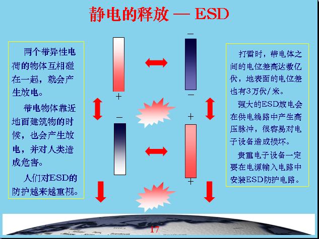剛才跟大家介紹一下什麼叫雷電和ESD,ESD就是靜電放電,雷電也屬於靜電放電,所以大家都知道ESD的危害性有多大。地球每秒鍾大概就有100多次閃電,每閃電一次能量就可以提供100w的燈泡供我們用3個月,在雨季平均每6分鍾就有一個人被雷電擊中,中國還不是受雷電受害最集中的地區,在非洲這些地區受雷擊更嚴重,上海電視塔平均每年要遭受33次大的雷擊,今年4月13日上海電視台電子設備遭受不同程度的雷擊,天線站玻璃鋼都起火了,變成一個大火球燒起來了。還有一次是1992年在北京國家氣象中心也受到雷擊,損失了2000duowanyuan。zaiquanshijiemeinianshouleidianjihuaideshebeidoushiyiqianwanweidanwei,meinianzaoshoudesunshidoushishangqianyi。womenxianzaishiyongdedianzishebeijiageyuelaiyuegao,duifangleideyaoqiuyeyuelaiyuegao。