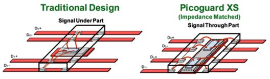 另一類是采用PicoGuard® XS技術的產品。這種類型設計使用阻抗匹配(Impedance Matched)電路,可保證100 Ω的阻抗,相當於電容為零。這類設計無需並聯電感,有助於最大限度地減少封裝引起的ESD電壓尖峰。