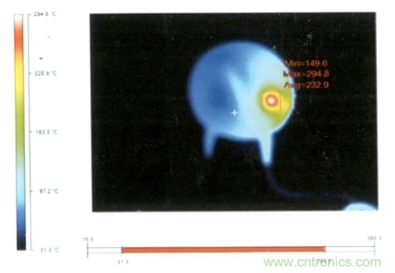 這種壓敏電阻通過擊穿點進行電流泄放,在泄流點會形成大量的熱量,這種熱量最終會導致壓敏電阻燒穿(見下圖)。