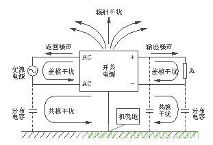 開關電源的電磁噪聲從噪聲源來說可以分為兩大類。一類是外部噪聲,例如,通過電網傳輸過來的共模和差模噪聲、外wai部bu電dian磁ci輻fu射she對dui開kai關guan電dian源yuan控kong製zhi電dian路lu的de幹gan擾rao等deng。另ling一yi類lei是shi開kai關guan電dian源yuan自zi身shen產chan生sheng的de電dian磁ci噪zao聲sheng,如ru開kai關guan管guan和he整zheng流liu管guan的de電dian流liu尖jian峰feng產chan生sheng的de諧xie波bo及ji電dian磁ci輻fu射she幹gan擾rao。