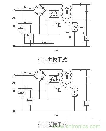 電源線噪聲是電網中各種用電設備產生的電磁騷擾沿著電源線傳播所造成的。電源線噪聲分為兩大類:共模幹擾、差模幹擾。共模幹擾(Common-mode Interference)定義為任何載流導體與參考地之間的不希望有的電位差;差模幹擾(Differential-mode Interference)定義為任何兩個載流導體之間的不希望有的電位差。兩種幹擾的等效電路如圖2[1]所示。圖中CP1為變壓器初、次級之間的分布電容,CP2為開關電源與散熱器之間的分布電容(即開關管集電極與地之間的分布電容)。