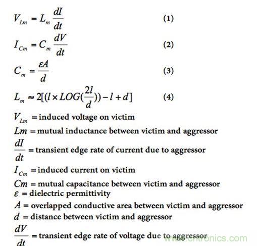方程式(1)和(2)分別是入侵信號對受害信號的感應電壓和電流計算公式,方程式(3)和(4)分別是入侵信號和受害信號之間的互電容和互電感計算公式。