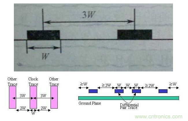 3W原則是指多個高速信號線長距離走線的時候,其間距應該遵循3W原則,例如時鍾線,差分線,視頻、音頻信號線,複位信號線及其他係統關鍵電路需要遵循3W原則,而並不是板上所有的布線都要強製符合3W原則。