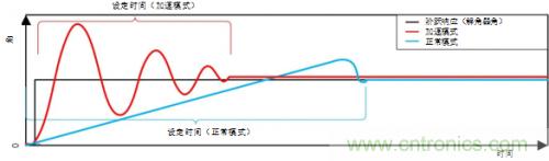 當旋轉變壓器的電機位置或輸出信號變化迅速時,穩定時間是RDC控製係統的快速性能指標[2]。圖1顯示的一個是有階躍輸入變化(黑線)的RDC反饋控製係統的穩定時間的例子。藍色信號顯示的是對電路的正常模式響應,紅色信號顯示的是加速模式過程中響應(角快速變化)。為了在快速變化的條件下追蹤到旋轉角,加速模式幫助控製回路很容易跟蹤到一個快速的旋轉角[4]。