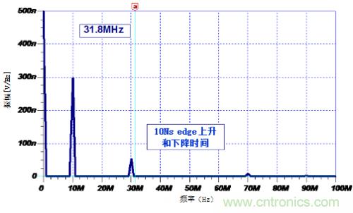 根據該公式,10nsEdge Rate對應的諧波頻率大約為31.8MHz。圖3顯示:最後一個重要的諧波頻率為30MHZ。同時,1ns的Edge Rate對應的諧波頻率318MHZ(圖2)。如果頻率範圍擴展到300MHZ以外,顯示的諧波仍很明顯,但卻在相關頻率上迅速變小。