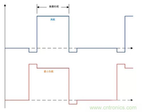 低到高的死區時間。當低側MOSFET關斷且高側MOSFET再次導通之前,通過電感器的電流對開關節點處的電壓進行充電,直到高側MOSFET的體二極管鉗位開關節點電壓。結果,死區時間的低側MOSFET關斷到高側MOSFET期間,開關節點為高。由於開關節點在該時間段為高,因此低到高的死區時間增加了有效最小脈衝寬度。在圖1中,您可看到,雖然導通時間相同,但脈衝寬度更大。