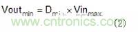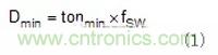 試圖在2MHz條件下工作時的第二個考慮因素是最小輸入電壓(VIN)和輸出電壓(VOUT)的轉換比。這與轉換器的最小接通時間有關,因為該比率在轉換器需要操作時設定接通時間。例如,若轉換器具有100ns的最小導通時間且在2MHz條件下工作,則使用公式1,其可以支持的最小轉換比(Dmin)為20%。若給定的VIN至VOUTbisuoxudedaotongshijianxiaoyuzuixiaodaotongshijian,zeduoshuzhuanhuanqijinrumaichongkuayuemoshiyibaochishuchudianyawending。dangmaichongkuayueshi,kaiguanpinlvfashengbianhuaqiekenengzaixuyaoxianzhizaoshengdepinlvzhongyinqizaosheng。