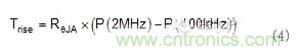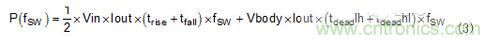 與開關頻率相關的轉換器中的兩個主要損耗是高側MOSFET和死區時間損耗的開關損耗。等式3是這些損失的基本估計,您可用它進一步分析伴隨較高開關頻率損耗增加的影響。例如,若為5V輸入、4A負載、3ns上升時間、2ns下降時間、0.7V體二極管壓降和20ns死區時間,預估功率損耗在2MHz時為325mW,在400kHz時為65mW。