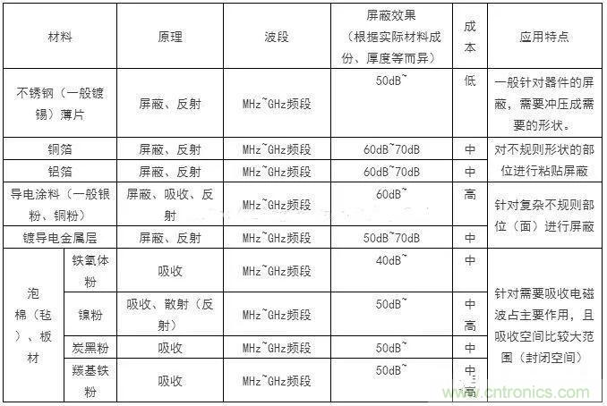 不鏽鋼、銅箔、鋁箔、導電塗料、電磁波吸收材料(鐵氧體、鎳粉、碳黑、羰基鐵等)。